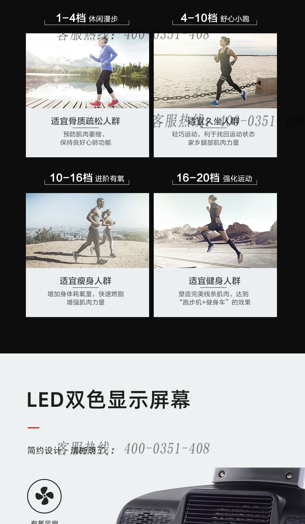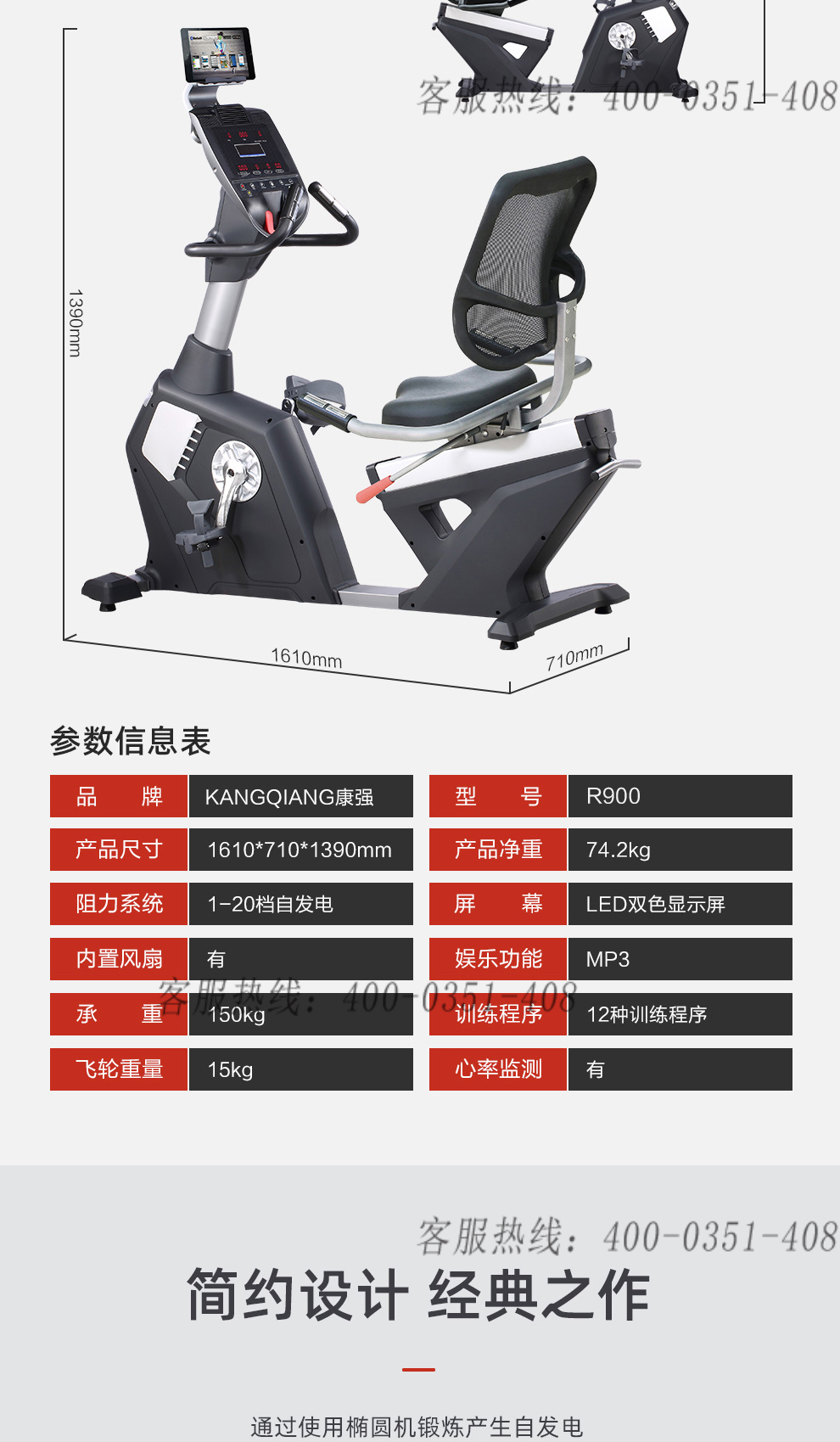 阻力系统:1-20档自发电 | 屏幕:LED显示屏 | 内置风扇:有 | 承重:150kg |